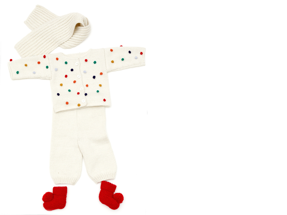 cardigan/ cardigan/ Jäckchen white with multicolor dots détail baby scarf/ écharpe bébé/ Baby Schal white détail trousers/ pantalon / Höschen whitedétail booties/ bottines/ Schühchen red détail