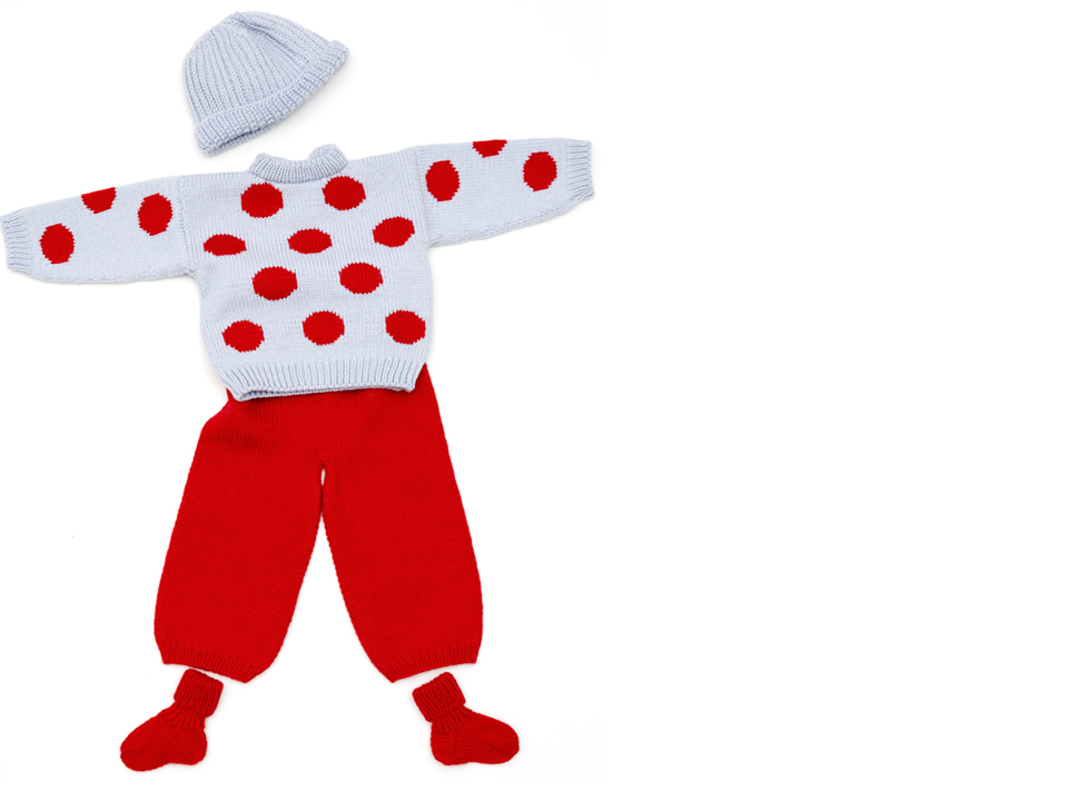 pullover/ pullover/ Pulloverpale blue and red dots détail trousers/ pantalon / Höschen red détail socks/ chaussettes/ Söckchen red détail hat/ bonnet/ Mütze pale blue détail