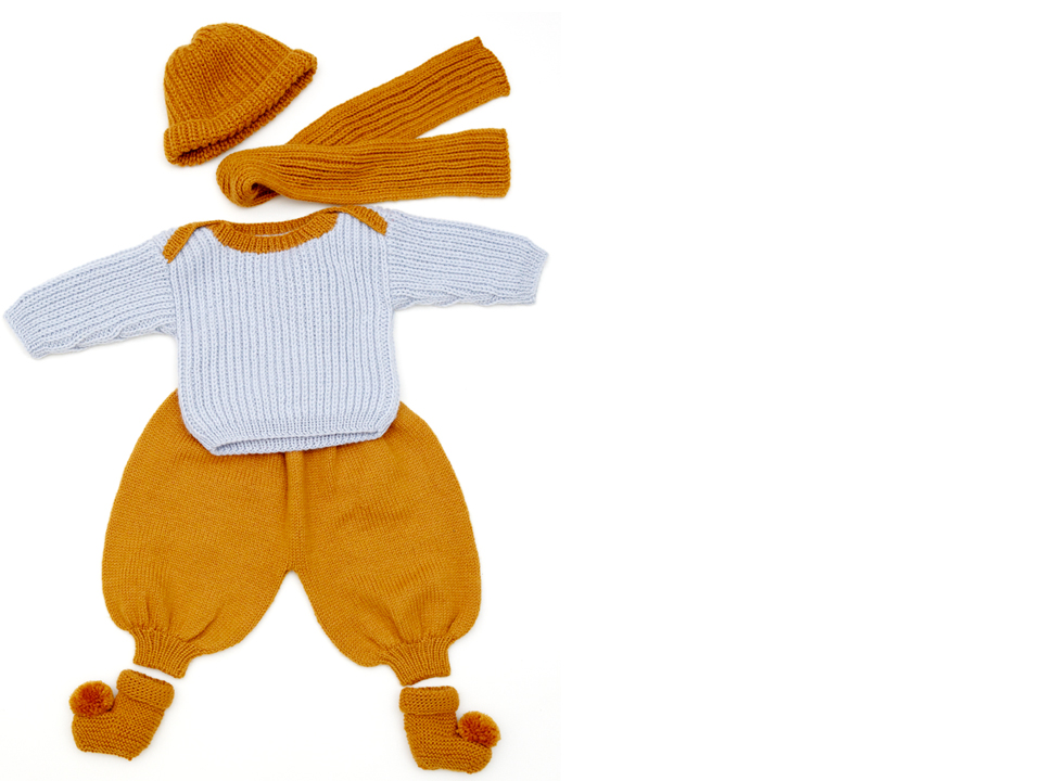 Kalle pullover/ pullover/ Pullover pale blue and cognac détailtrousers/ pantalon bouffant/ Höschen cognac détailbaby scarf/ écharpe bébé/ Baby Schal cognac détailhat/ bonnet/ Mütze cognac détailbooties/ bottines/ Schühchen cognac détail